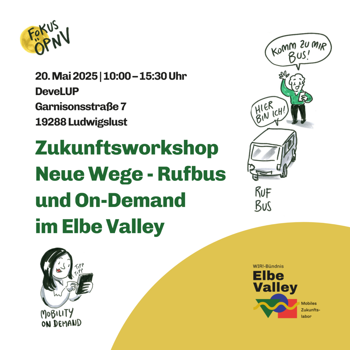 Das Projekt Mobiles Elbe Valley lädt herzlich zum zweiten Zukunftsworkshop „Neue Wege im Elbe Valley“ ein. Gemeinsam mit Vertreterinnen und Vertretern aus Verwaltung, Verkehrsunternehmen und weiteren regionalen Akteuren werden die Herausforderungen, Erfolgsfaktoren und zukünftigen Entwicklungsmöglichkeiten von Rufbus- und On-Demand-Angeboten in der Region beleuchtet.